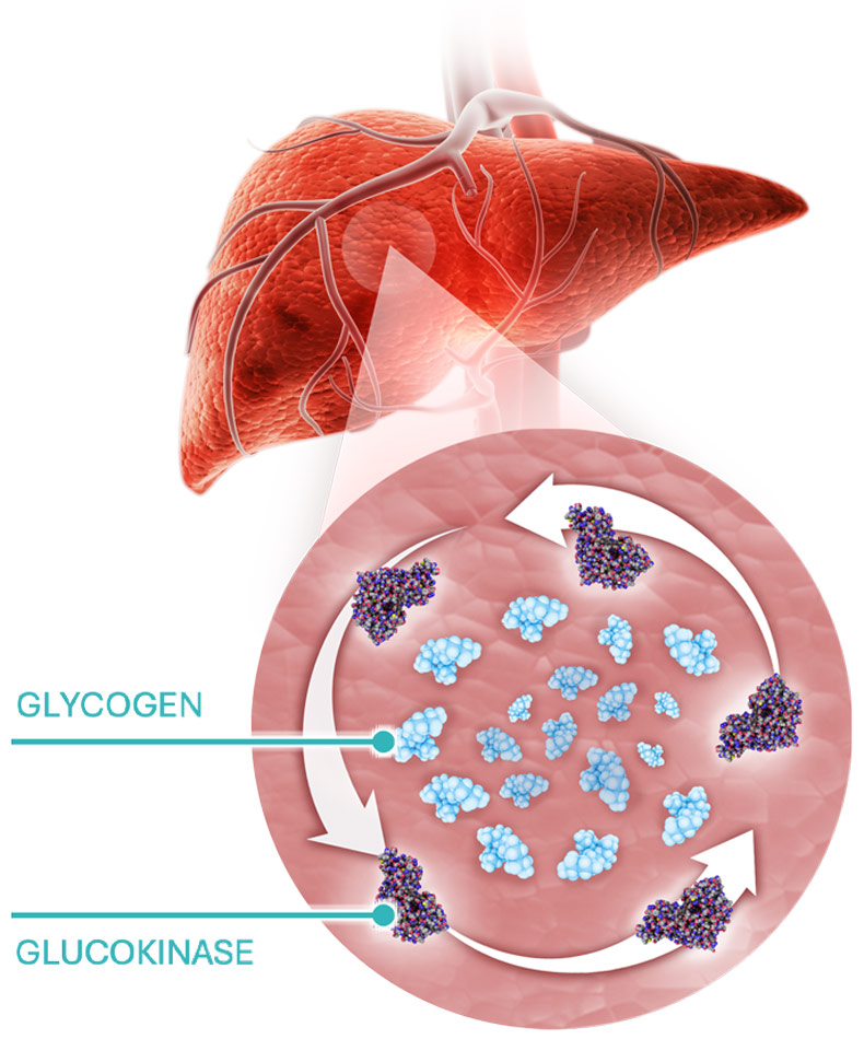 Cadisegliatin is designed to support glucose management in people with T1D by activating glucokinase in the liver. Selectively targeting the liver, cadisegliatin may help restore the liver’s natural role for controlling blood glucose, supporting the conversion of glucose to glycogen for storage and reducing blood glucose. Glycogen reserves in the liver can then be broken down to glucose and released into circulation when needed to increase blood glucose levels.